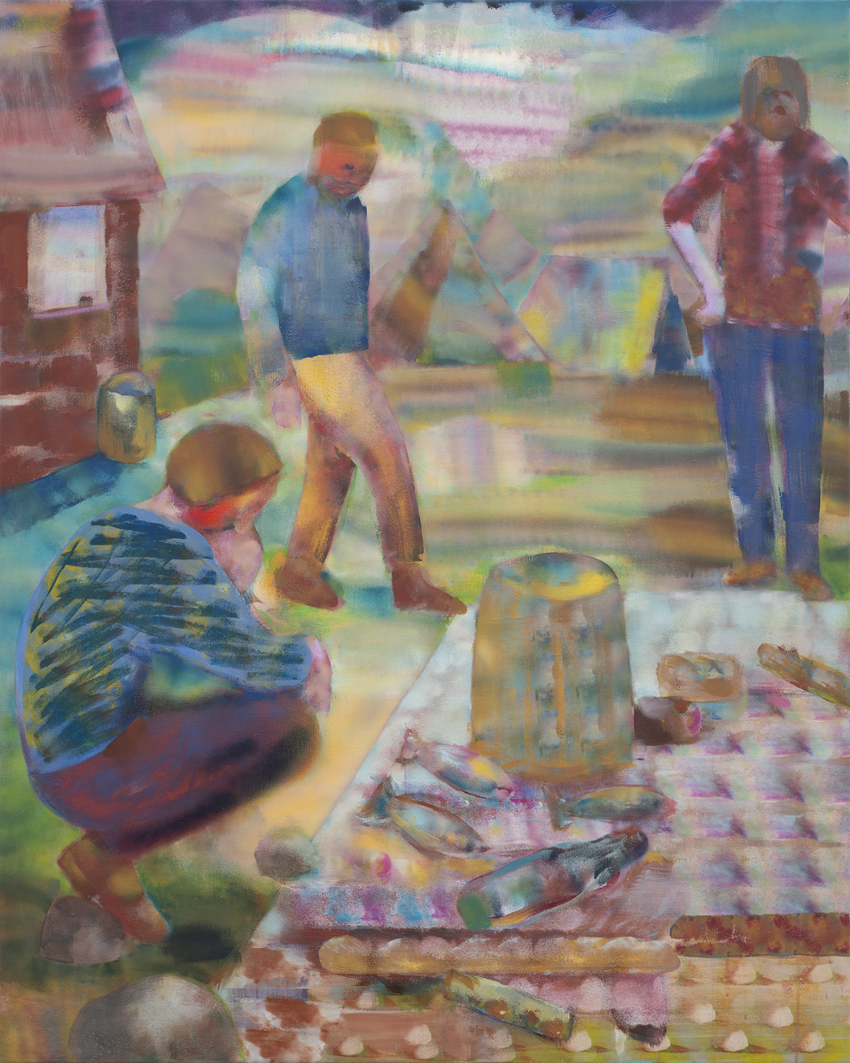 On closer inspection, one notices the flatness and dullness of the paintings’ surfaces. In recent years Busch has used acrylic and dispersion paint. In contrast to more substantial oils, acrylics may be mixed with water, being runnier and quick drying. These paints engender a dull and matt facture. Busch paints on the floor, gradually applying the wet paint layer after layer. Gestural marks left by the brush to indicate the physical presence of the painter are sparse. Here too, Busch plays with a strategy of subtle opposition. Indeed, heroic painterly gestures and mad gesticulations in oils are foreign to Busch. Instead – reminiscent of his training as a stage set painter – Busch quotes the aesthetic of theatre scenery. He makes conscious reference to the temporary and provisional nature of such painting to subtly oppose notions of the painting as a fetish and artistic creation as a spectacular act. And yet … Peter Busch paints. To claim that his paintings be ‘immaterialised’ would perhaps be somewhat far-fetched. But the painter undertakes all he can in an attempt to counteract painting as a medium. And paradoxically, he achieves this with the very devices of painting. Busch counters the validity of the painted canvas with the motive of transience. He equips the canvas with forms, colour and shapes in order to represent an action. At the same time however, the simulative quality of the chosen images, the subdued palette and the renunciation of painterly pathos express Busch’s scepticism towards his own preferred medium. Busch’s work evolves from the critical interplay between fascination and sceptic reservation: Yet the scene of his investigations remains the picture.