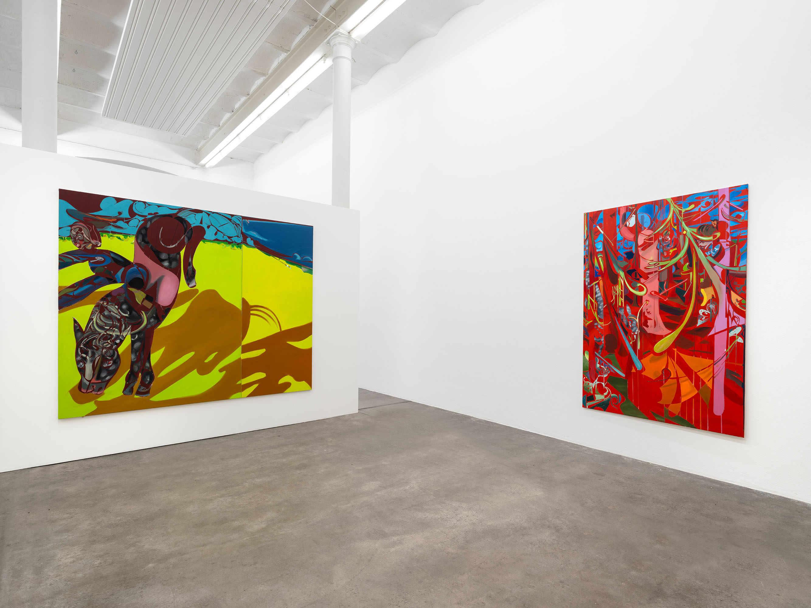 In Pop Antenne zeigt Max Hechinger neue Arbeiten, in denen sich seine Malerei als System aus Bildzeichen, Erzählfragmenten und Wiederholungen entfaltet. Mit scharfen Konturen, holzschnittartigen Formen und typografischen Setzungen ordnet er Figuren, Tiere und Objekte — Pferde, Bäume, Antennen — innerhalb klar strukturierter Bildräume.