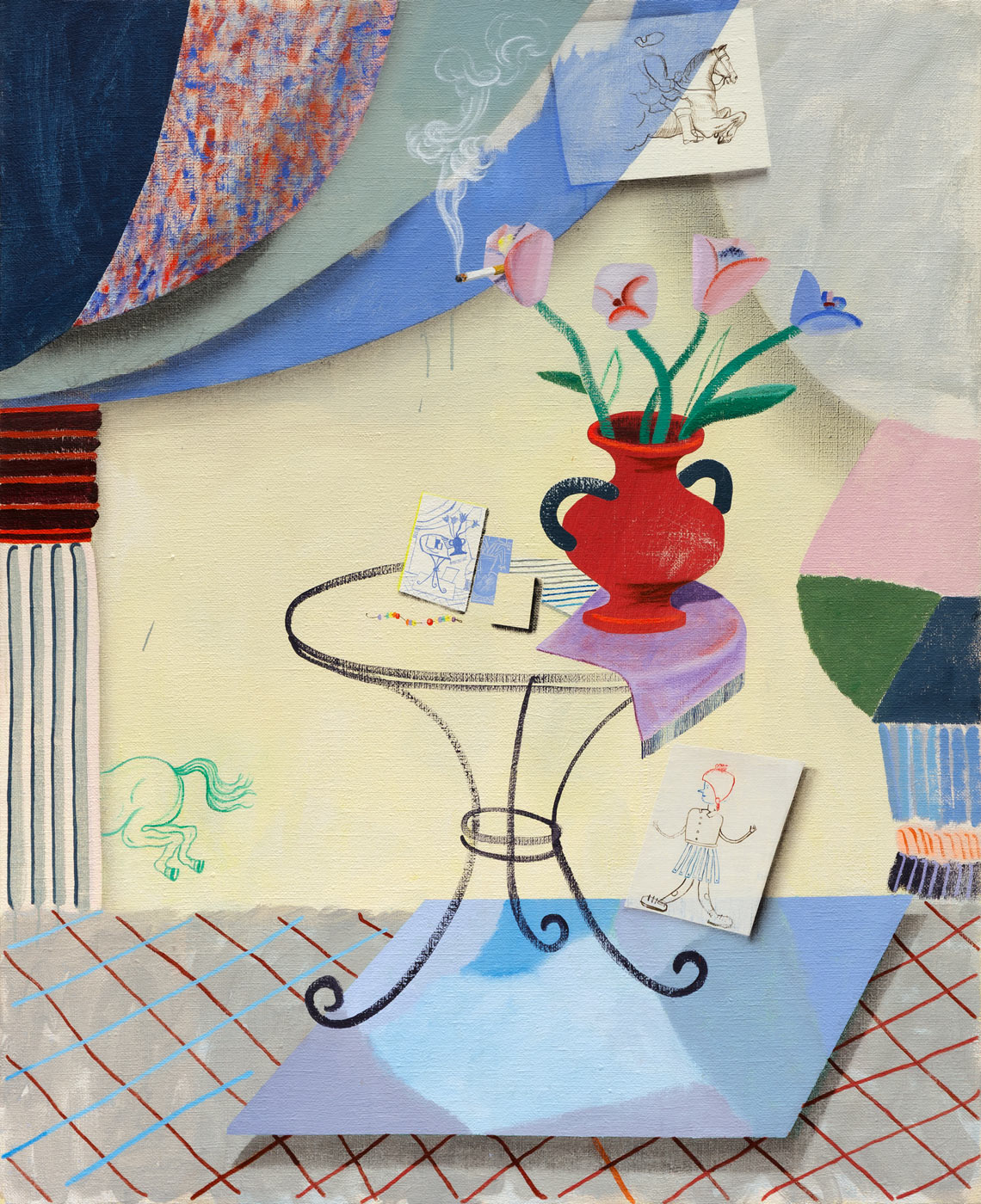 Monsieur Tableau könnte ein großer Bruder der aktuellen Werkserie der Actors/Models/Dudes sein: Hier klebt Henriette Grahnert aus Mode- und Handarbeitsmagazinen ausgeschnittene figurative Versatzstücke auf die Leinwand. Arme, Kopfbedeckungen und Accessoires wachsen über das durch die Außenkanten des Bildträgers begrenzte Format hinaus. Breite Pinselwischer deuten Körpersilhouette und Physiognomie der Protagonisten an. Jedoch verkehren sich die expressiven Gesten schnell in das Gegenteil: Zufall und Vorsatz verbrüdern sich, und aus dem vermeintlich Unkalkulierten formen sich planvolle Zwitterwesen zwischen Abstraktion und Figürlichkeit. Individuelle Namen verleihen Persönlichkeit: Ulla von Basta (2015) verschränkt die Arme so vehement vor dem Oberkörper, dass ihre Haltung zu einem einzigen trotzigen „Basta“ wird. Olaf Ohnesorg (2015) versenkt die Hände lässig und tatsächlich ziemlich sorglos in den Hosentaschen, und Maasha Tagliatowa (2015) erinnert mit kokett in die Seiten gestemmten Armen an eine resolute Aeroflot-Stewardess.