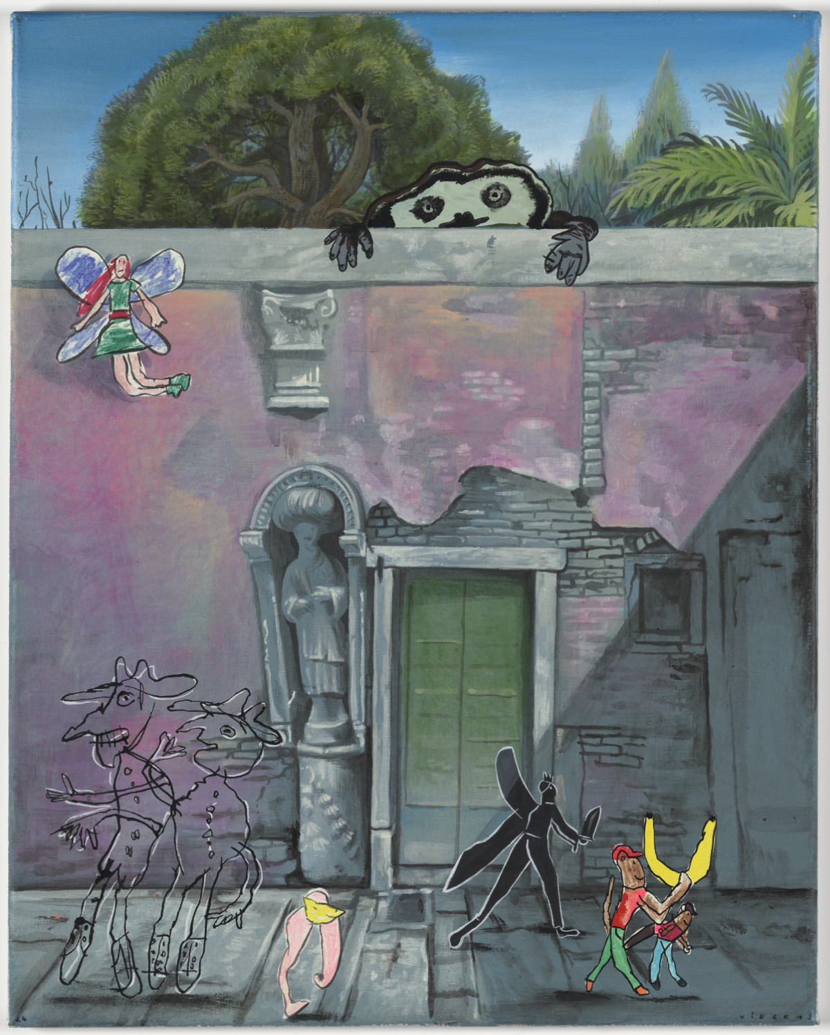 In den Werken von Viezens sind viele Analogien zu seinen persönlichen Vorbildern zu erkennen, ohne, dass sie dadurch epigonal wirken. Neben der Technik des Verfremdens und des humorvollen Aufgreifens von Gegensätzen arbeitet der Künstler auch gerne mit collageartigen Kompositionen. So ist die „Versuchung des Heiligen Antonius“ von dem Gemälde des italienischen Renaissancemalers Bernardo Parentino inspiriert, setzt aber die nur grob in der Komposition an das Vorbild erinnernden Monster und Versuchungen vor eine stacheldrahtbewehrte Mauer. Der am Boden in Abwehrhaltung ausgestreckte Heilige Antonius trägt die typische „Viezens“-Maske. Erstaunlicherweise wirkt das kleinformatige Gemälde (49,5 x 54 cm) gerade dadurch so erschütternd intensiv, weil – wie so oft bei Viezens – genau das emotionale Zentrum des Bildes, der Kopf des heimgesuchten Heiligen, ein blinder Fleck ist. Platz für unsere eigenen Projektionen, Ängste und Qualen. Steve Viezens meint zu dem Bild: „Obwohl das Bild sehr „gegenständlich“ ist und auch kunsthistorische Bezüge hat, sind diese intuitiv gewählt, nicht bewusst. Ich wurde, als ich dieses Bild malte, von meinen eigenen geistigen Dämonen nicht nur heimgesucht, sondern regelrecht verprügelt. Als ich das Bild fertig vor mir sah, wusste ich – ich muss in meiner Lebenseinstellung was ändern!“